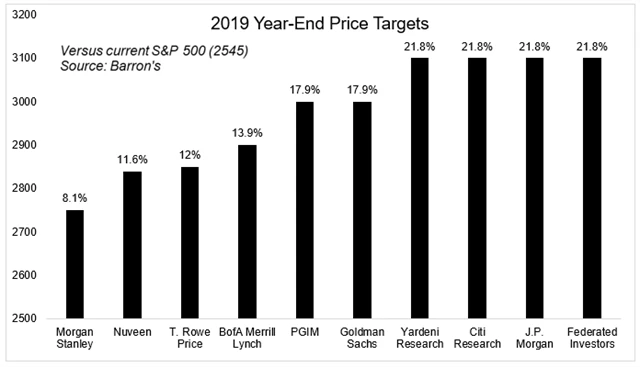 "Téměř každý, kdo má zájem o akcie, chce, aby mu někdo jiný řekl, co si myslí o směřování trhu do budoucna. A jelikož existuje poptávka, musí být vyrovnána nabídkou," řekl kdysi proslulý investor Benjamin Graham. Nabídka v současnosti existuje ve formě nespočtu předpovědí analytiků a stratégů. Na několik takových předpovědí s cílovými cenami na rok 2019 se podíval magazín Barron's loni v polovině prosince.