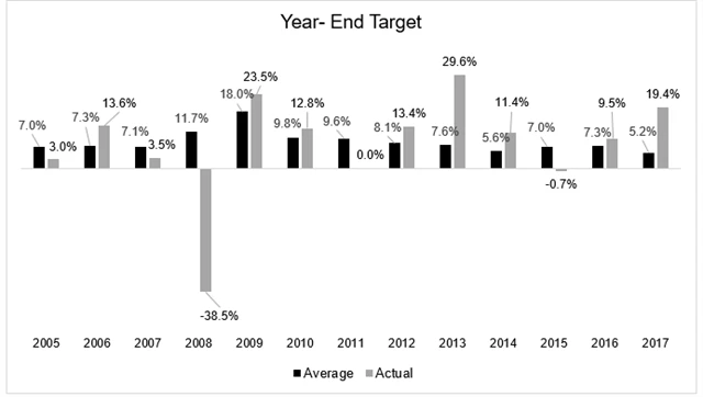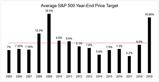Michael Batnick z Ritholtz Wealth Management prozkoumal cílové ceny od roku 2005 a zjistil, že ze 153 odhadů jen v šesti případech analytici očekávali nižší úroveň indexu S&P 500. Průměrná predikce se pohybovala okolo +9 %, což se (jaké překvapení) blíží průměrnému ročnímu výnosu.