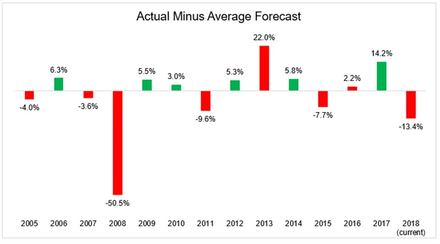 Predikce, a zejména ty na akciovém trhu, si žijí vlastním životem a málokdy se naplní. Na dalším grafu jsou rozdíly mezi predikcemi analytiků a tím, co se na akciovém trhu v USA skutečně dělo. Rok 2018 byl ukázkou toho, v co může vyústit přílišný optimismus, jakkoli mohlo jít o výjimečný případ. Průměrná chyba predikce je ale od roku 2005 téměř 11 procentních bodů, což není málo.