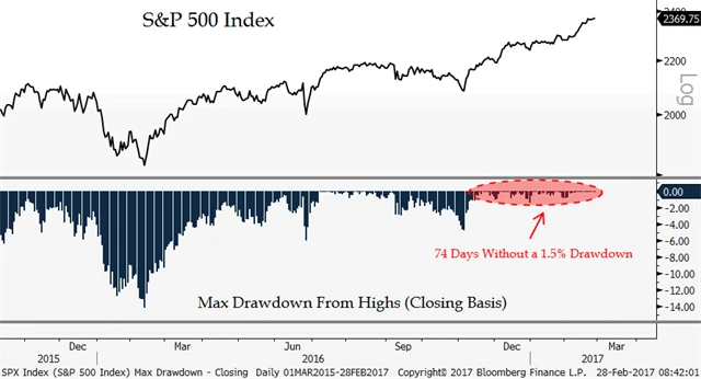 Jeden chytrý pán z MKM Partners na to upozornil na konci února. Těch dnů, kdy index neklesl alespoň o 1,5 % ze svých 52týdenních maxim, je dnes již 77. Hra s čísly, ale možná o něco zajímavější série. Mimochodem, v roce 1964 takto definovaná trvala 126 obchodních dnů, ta současná je od té doby nejdelší.