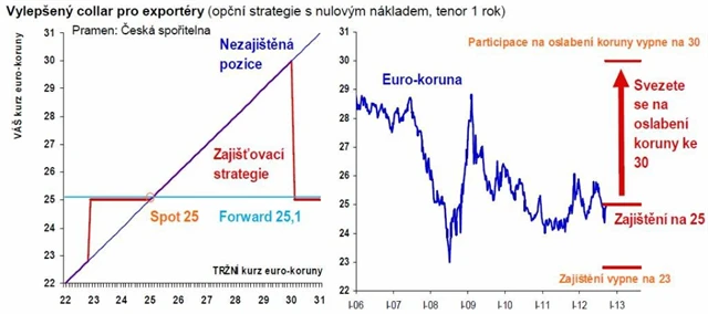 Příklad takové strategie je níže, indikativní úrovně jsou pro splatnost 1 rok. Tento collar zajistí proti oslabení eura na 25, ale současně dá možnost svézt se na případném posílení eura až ke 30. Bohužel, obědy zdarma na trzích nejsou. Výhody této strategie jsou kompenzované tím, že: