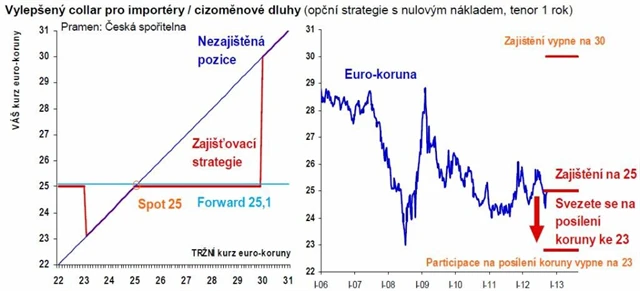 Příklad takové strategie je níže, indikativní úrovně jsou pro splatnost 1 rok. Tento collar zajistí proti posílení eura pod 25, ale současně dá možnost svézt se na případném oslabení eura ke 23. Bohužel, obědy zdarma na trzích nejsou. Výhody této strategie jsou kompenzované tím, že: