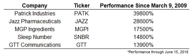 Ben Carlson ze společnosti Ritholtz Wealth Management v jednom ze svých nedávných článků publikoval seznam nejvýdělečnějších titulů v období ode dna posledního medvědího trendu v březnu 2009. Výnosy uvedené v tabulce (výnosy jsou k 15. červnu 2018) jsou skutečně z jiného světa.