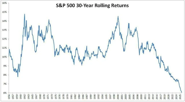 Pokud by v následujících 10 letech měly americké akcie nabízet roční výnos jen okolo 2,5 %, dlouhodobé výnosy v období mezi lety 1996 až 2026 by byly tristní. Dokonce bychom se mohli stát svědky nejhoršího 30letého období za posledních sto let, dokonce horšího, než kdybychom začali investovat na vrcholu v roce 1929.