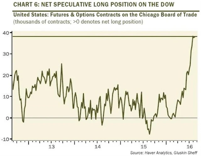 Spekulace na to, že index Dow poroste, jsou na maximu. Přesněji rekordním maximu. Pokud se někdo obává o osud amerického akciového býčího trhu, má o důvod více. Na grafu jsou zobrazeny spekulativní dlouhé pozice v indexu Dow na burze Chicago Board of Trade.
