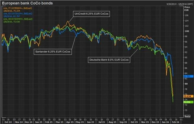 Vývoj na trhu s CoCo dluhopisy je skutečně dramatický. Investoři se podmíněně konvertibilních dluhopisů snaží zbavit, což sráží jejich ceny. Například cena CoCo bondů s 6% kupónem emitovaných německou Deutsche Bank spadla na zhruba 75 % výchozí hodnoty. O moc lépe se nedaří ani CoCo bondům italské UniCredit či španělské Banco Santander s kupónem 6,25 %.