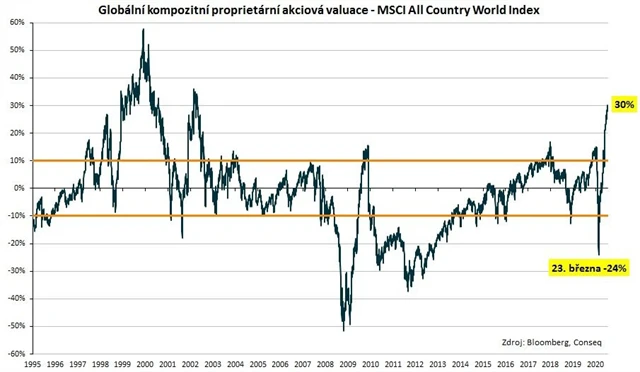 Proto se námi sestavovaný ukazatel ocenění vyšplhal již na 30 %. To je úroveň, na které byl naposledy v roce 2002. Je tak výrazně nad neutrálním pásmem -10 % až +10 %, ve kterém lze považovat ocenění globálních akciových trhů za férové či neutrální.