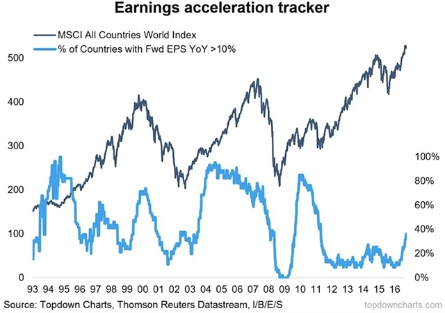 Stále více zemí, respektive jejich akciových trhů, vyhlíží s optimismem další vývoj ziskovosti firem. A jakkoli je výhled ziskovosti (a sním třeba i takzvané forwardové P/E) velice měkký indikátor, ukazují očekávání růstu zisků na zásadní změnu nálady v ekonomice. Trh věří, že hospodářství poroste a s ním i příjmy společností.