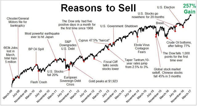 Michael Batnick ze společnosti Ritholtz Wealth Management se pokusil sepsat všechny důvody, proč (by) měli investoři v průběhu posledních devíti let prodávat akcie. Nakonec sepsal celkem dlouhý seznam a poskládal ho do grafu.
