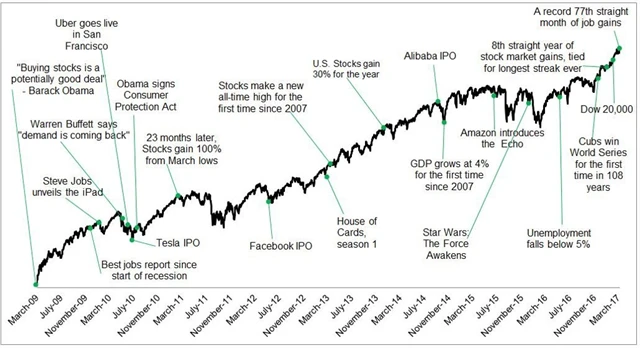 Podobných grafů je plný internet. Batnick chtěl ale také sestavit graf, v němž budou vypsány důvody pro růst cen akcií. Zjistil ale, že je to mnohem složitější. Připomnělo mu to výrok Billa Gatese: "Titulky v médiích jsou většinou zavádějící. Špatné zprávy se vždy objeví v titulcích, zatímco postupné zlepšování situace nikoli."