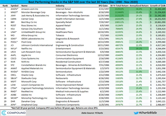Které akcie z indexu S&P 500 předvedly za uplynulých třicet let nejlepší výkon? Mnohé se do první třicítky dostaly navzdory tomu, že se s nimi neobchoduje po celou dobu, dané firmy zkrátka upsaly akcie na burze až po roce 1990.
