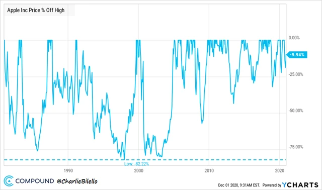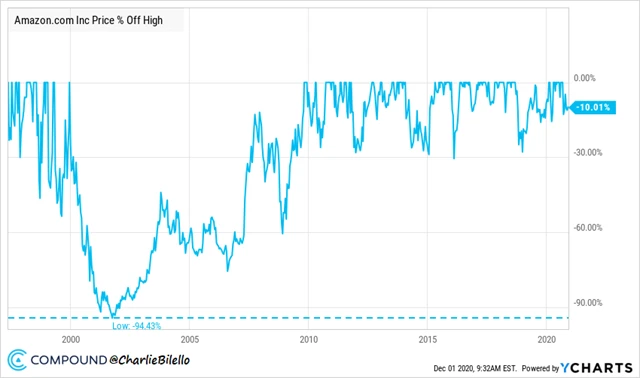 Navzdory tomu. Počkejte, nemůže to být třeba o díky tomu? Tušíte správně, může! Dechberoucí výkonnost v horizontu třiceti let totiž nezřídka zahrnuje dlouhé etapy zdrcujících ztrát, které ustát (a držet pozice v daném titulu) opravdu nebylo jen tak. Stačí se podívat na Amazon, který prodělal ztrátu hlubší než 90 %, nebo Apple (přes -80 %).