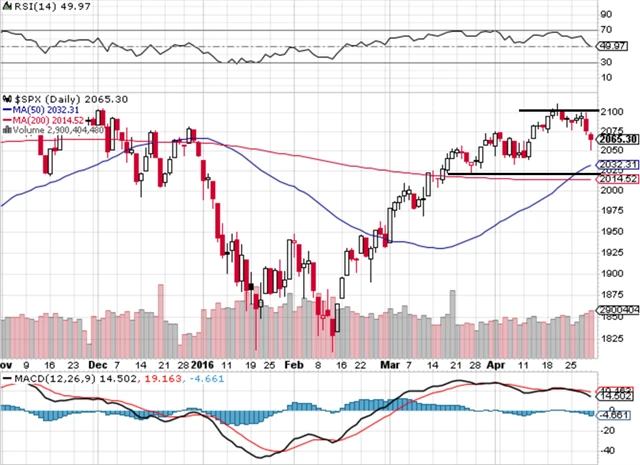 Index S&P 500 má za sebou další neúspěšný pokus o překonání hladiny 2 100. Na opačné straně je nejbližší silný support v pásmu 2 020 až 2 000. Nad ním je ještě jako taková zpomalovací síť série denních minim ze začátku dubna v pásmu okolo 2 040.