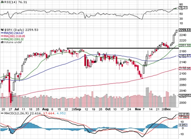 Během pondělí a úterý zaznamenal index S&P 500 pouze nepatrné růsty a vystoupal k rezistenci okolo 2 190. Překvapující byl razantní, bezproblémový růst nad 2 200. Ve čtvrtek a v pátek pak hybná síla působila stejným směrem.