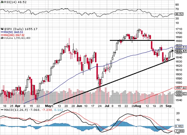 Index S&P 500 posílil v prvním zářijovém týdnu o 1,4 % a korigoval srpnové ztráty. Již dva týdny se obchoduje pod 50denním klouzavým průměrem, z něhož se, zdá se, stává silná rezistence. Cena v pátek jen otestovala tuto hladinu a začala klesat.
