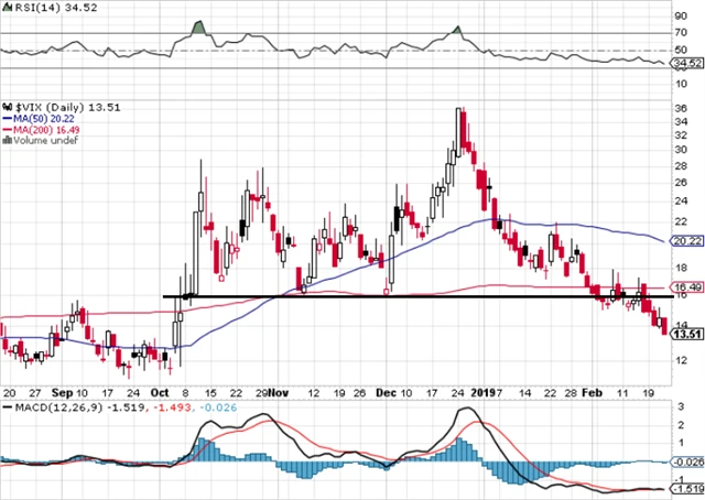 Index volatility VIX opět o něco klesl. Je pod 14 a v sestupném trendu, a pro akcie tak vysílá býčí signál. Na podobných hodnotách byl loni v létě, kdy index celkem pravidelně uzavíral na historických maximech, z nichž pak v říjnu rychle spadl o 10 %.