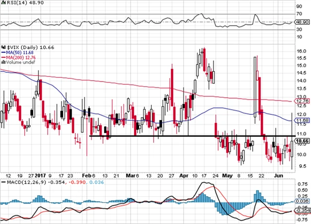 Index volatility VIX zůstává na nízké úrovni. Výraznější vývoj nastal pouze v pátek, ale v závěru se VIX vrátil pod 11, tedy pro akcie nadále vysílá býčí signál.