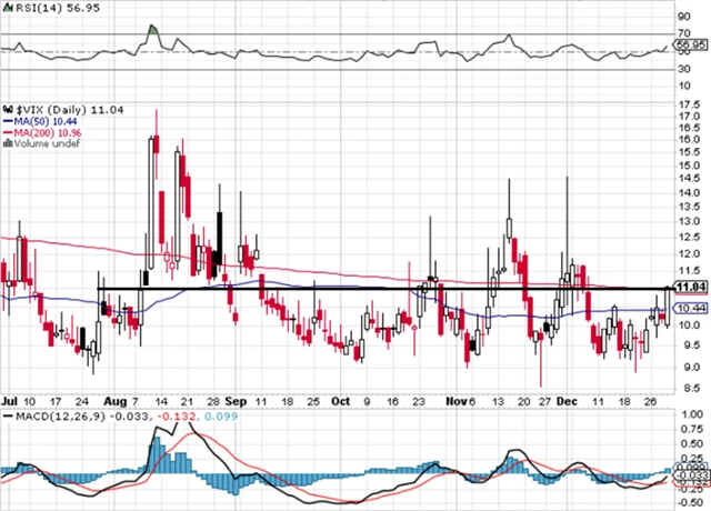 Index volatility VIX se vrátil ke svému průměru okolo 11. Další růst a vytváření trendové čáry by bylo pro akcie negativním signálem.