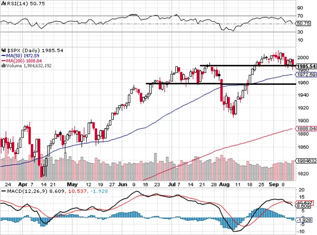 Index S&P 500 za uplynulý týden ztratil 1,1 % a testuje support na červencových maximech v zóně 1 980 až 1 990 bodů. Další hladiny podpory jsou na 50denním klouzavém průměru 1 972 a v zóně okolo 1 960.