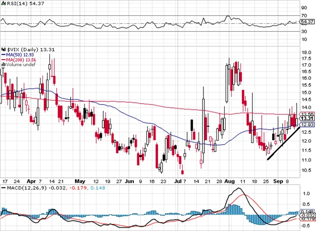 Na indexu volatility se formuje růstový trend, přesto VIX zatím zůstává na nízkých hodnotách. Prolomení trendové čáry by bylo pozitivním signálem pro další růst cen akcií. VIX se po pátečním intradenním růstu o 11 % zklidnil a přidal jen 4 %.