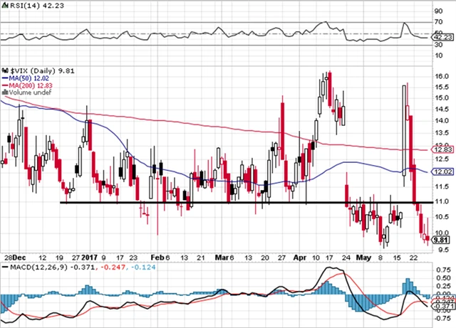 Index volatility VIX je na minimu pod 10, neformuje se na něm žádný růstový trend, a pro akcie proto vyznívá pozitivně. Situace je stejná jako zhruba před dvěma týdny – VIX je tak nízko, že již klesat téměř nemůže. Co tedy čekat? Buď v červnu a červenci zůstane trh v "letním módu", nebo ještě do prázdnin přijde pořádná bouřka.