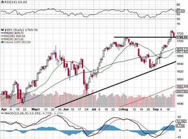 Index S&P 500 se v týdnu opět zazelenal. Novou krev do žil vlil trhům Fed středečním prohlášením o pokračování QE beze změny. Ve čtvrtek se situace začala zklidňovat a v pátek se index vrátil na první support, který je na předchozích maximech v zóně 1 710 bodů.