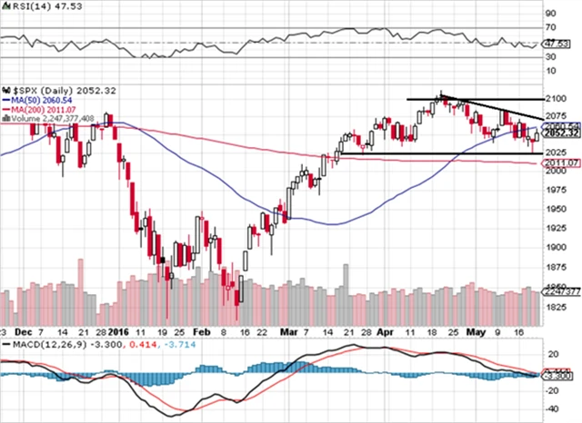 Index S&P 500 zůstává v jarním rozpětí, ale na jeho denních svíčkách se zformoval sestupný trend. Od dubnových maxim nad 2 100 klesl o 80 bodů, neuzavřel ale pod důležitou hladinou podpory 2 040. Případná nižší závěrečná cena pravděpodobně určí další vývoj směrem k 200dennímu klouzavému průměru. Z úrovně 2 070 až 2 080 se stala rezistence, která brání růstu k 2 100. Proto případná zavírací cena nad 2 080 zřejmě určí vývoj býčím směrem.
