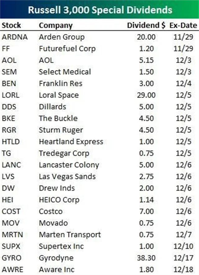 Arden a Futurefuel již mají své rozhodné datum za sebou, zbývající firmy z následujícího seznamu ale ještě do konce roku vyplatí mimořádnou dividendu. Jde o akcie menších firem z indexu Russell 3 000, ale některé jsou velice známé, například hned AOL, která má rozhodný den pro výplatu dividendy v pondělí.