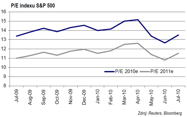 Investoři navíc na tyto odhady aplikují ve srovnání s běžným P/E v ranné fázi cyklu výrazný diskont zahrnující již např. riziko deflace. Aktuální úrovně indexu S&P 500 okolo 1 100 bodů (při konsensuálním odhadu nárůstu proforma EPS o 37 % na 83,2 USD) tak lze ospravedlnit předpokladem velmi slabého růstu HDP ve druhé půlce roku v kombinaci s deflací, nižší ocenění už by vyžadovalo předpoklad "dvojitého dna".
