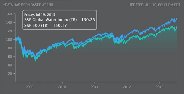 Výkonností akcie firem zaměřujících se na zpracování a distribuci vody dlouhodobě překonávají trh, což je patrné z porovnání indexu S&P Global Water Index s indexem S&P 500.