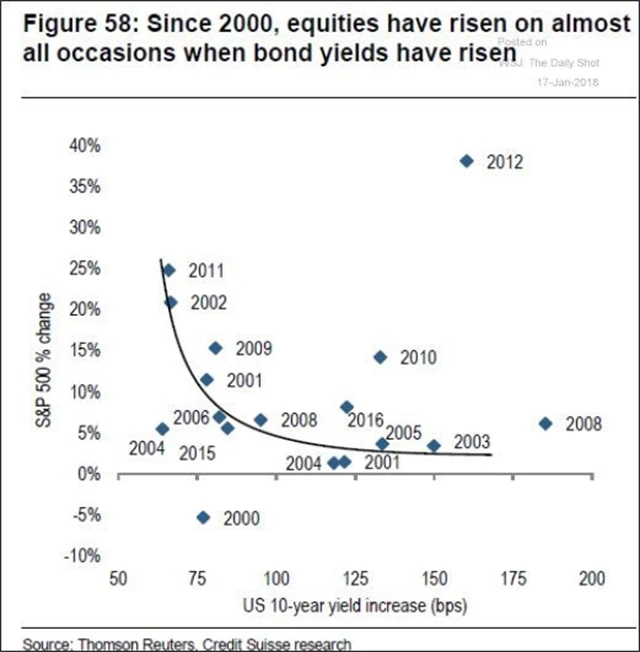 Od roku 2000 je růst výnosů dluhopisů USA většinou spojen s posilováním akcií