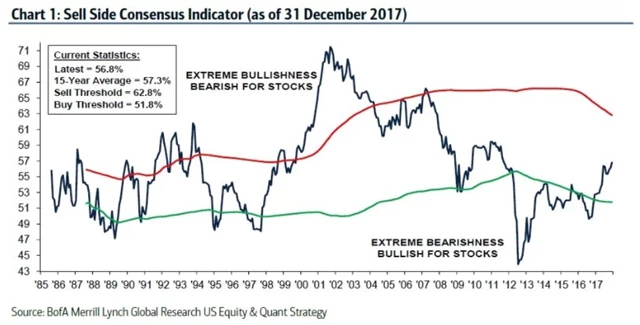 Bank of America Merrill Lynch sestavuje takzvaný sell side indicator, který ukazuje průměrnou doporučovanou míru alokace peněz do akcií. Podle banky šlo v minulosti o relativně spolehlivý kontrariánský ukazatel – přílišný pesimismus byl býčím signálem, optimismus naopak často předznamenával poklesy.