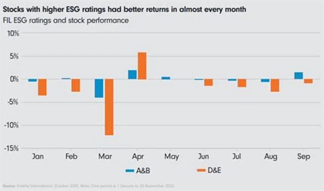 Podle Fidelity International akcie s vyšším ESG ratingem překonaly během prvních devíti měsíců roku 2020 ty s nižším ESG ratingem. Šlo přitom o turbulentní období těžce poznamenané pandemií covidu-19. Platilo to ve všech měsících s výjimkou dubna.