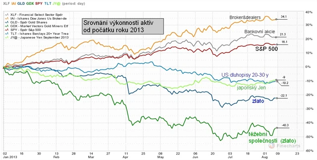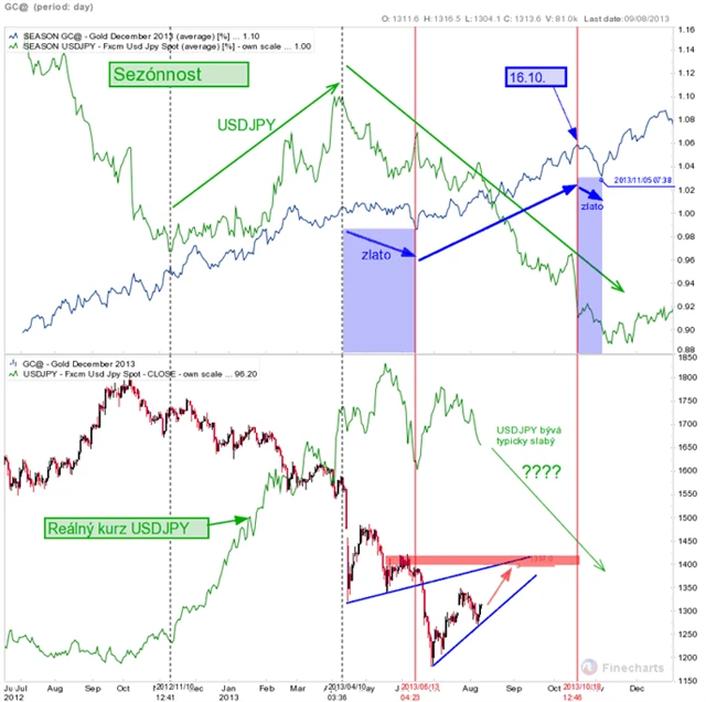 Podle mě jde o souhru více faktorů. Hlavní americké akciové indexy jsou silně překoupené, a nelze proto předpokládat, že bez korekce porostou stále výše. Americká ekonomika je navíc v relativně dobrém stavu a otázka snížení objemu odkupu dluhopisů ze strany americké centrální banky bude aktuální podle všeho již na příštím zasedání FOMC v polovině září. Odkupy dluhopisů byly přitom v posledním půlroce jednoznačně hlavním faktorem podporujícím vytrvalý růst cen akcií. Proto je docela pochopitelné, že se investoři a tradeři obracejí ke skupinám aktiv, jejichž ceny v uplynulém půlroce spíše klesaly. I sezónní faktory takový postup podporují, typicky totiž od srpna začíná příznivé období pro zlato, japonský jen a americké dluhopisy, naopak začíná relativně špatné období pro americké akcie a americký dolar.