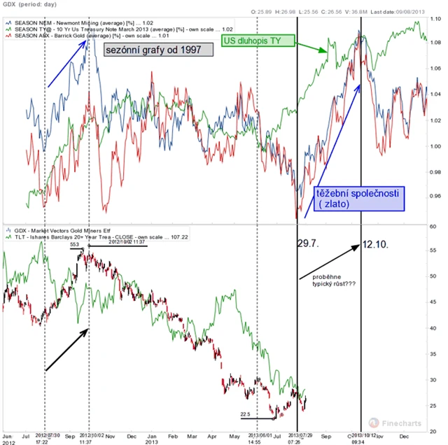 Pokud by cena zlata jen mírně rostla, nebo alespoň neklesala, mohla by tato skupina akcií zažít dobré období trvající až zhruba do poloviny října. V grafu je i křivka typického vývoje ceny desetiletého amerického státního dluhopisu TY (futures kontrakt, nahoře zeleně), v dolním panelu je aktuální cena dluhopisu TLT (ETF pro 20-30leté americké státní dluhopisy). Je patrné, že ceny dluhopisů bývají na podzim také silné a že by mohly začít korigovat předchozí propady.