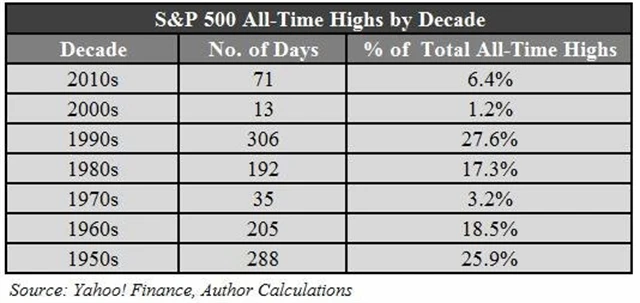 Jenže pravda je taková, že překonávání historických maxim a stanovování nových je na akciových trzích běžná věc. Od roku 1950 překonal index S&P 500 historické hodnoty ve více než 1 100 případech. To je 6,8 % všech obchodních dnů. Jinými slovy, přibližně jednou za 15 dní, kdy je burza otevřená, překoná index dosavadní rekord a stanoví nový.