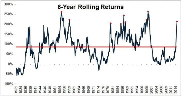 V 6letém horizontu americké akcie posílily o více než 200 % celkem čtyřiapadesátkrát. Průměrný zisk akcií po těchto obdobích růstu činil v horizontu následujících tří let 9 % (medián 20 %), zatímco průměrný historický zisk za tři roky činí 38 %. Pokud tedy akcie budou ve zdražování pokračovat, již by nemělo být tak silné.