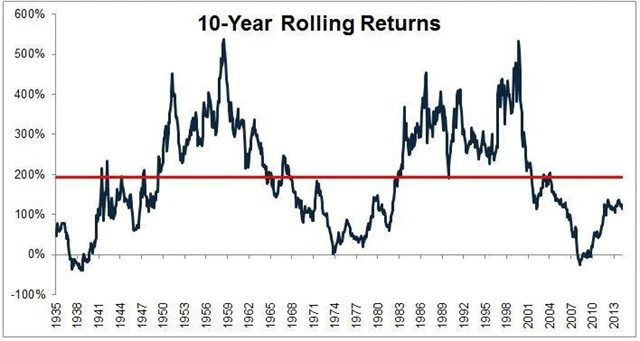 Výrazné zdražení amerických akcií za posledních šest let naznačuje, že by investoři měli být přinejmenším ostražití. Prodloužení horizontu vývoje na deset let však ukazuje, že rally ještě nemusí být u konce. Za posledních deset let americké akcie přidaly 115 %, zatímco historický průměrný nárůst jejich ceny za takto dlouhé období činí 192 %.