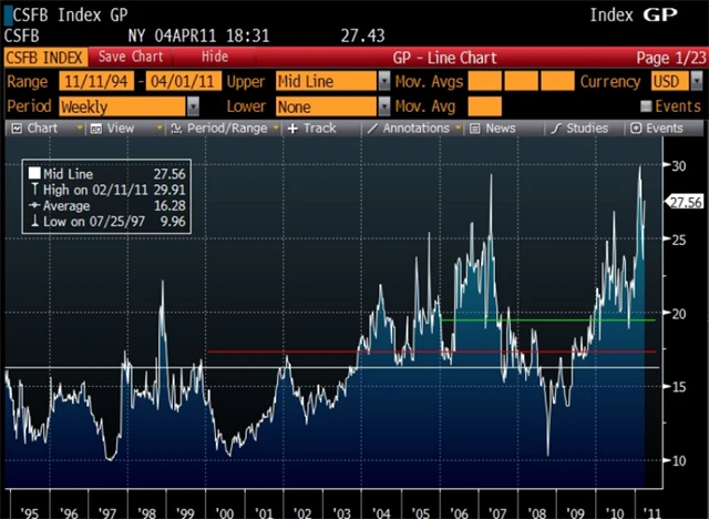 Trhy v posledních několika týdnech přesvědčivě ukázaly, jak lehce se umějí vypořádat se špatnými zprávami, jako bylo japonské zemětřesení, pokračující válka v Libyi, evropská dluhová krize nebo hrozba růstu úrokových sazeb. "Býčí idylická atmosféra" však může brzy skončit. Alespoň to indikuje tzv. barometr strachu, kterým měří tržní náladu na trzích švýcarská banka Credit Suisse. Od svého vzniku vykazuje index průměrnou hodnotu 16,3 %. V uplynulých pěti letech, kdy byly trhy velmi turbulentní, byl průměr 16 %. Od začátku letošního roku se index vyšplhal nad 25 %, což je podobně extrémní hodnota jako v dubnu 2007, kdy byl ten nejvyšší čas z akciového trhu vystoupit.