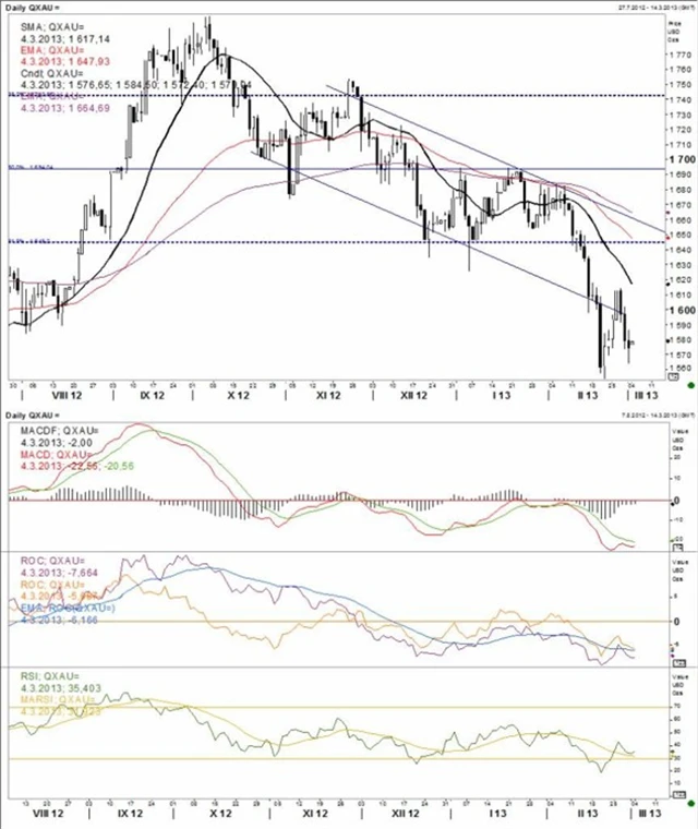 Prodeje fondů se zvyšují, nedávno se tento trend dokonce dostal na maximum od roku 1999, kdy se evropské centrální banky čile zbavovaly zlata ze svých rezerv. Zlatu se i navzdory uklidňujícím výrokům ze strany šéfa Fedu Bena Bernankeho, který obhajoval pokračování kvantitativního uvolňování, nepodařilo dostat nad technickou hranici odporu. Ta je nyní na hodnotě 1 620 USD za unci.