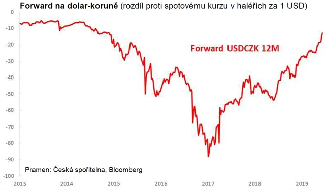 I když signály poklesu dolarových sazeb dosud nevytrhly kurz koruny z povalování se v pásmu 25,50-26,00 EUR/CZK, úroková výhoda hraje významnou roli. Z koruny se stává výrazně úročená měna nejen oproti euru, ale postupně vyrovnává i rozdíl oproti dolaru. Například roční forwardový kurz USD/CZK se aktuálně blíží pouhým 10 haléřům pod spotovým kurzem, přičemž loni na podzim to bylo 40 haléřů a na začátku roku 2017 celá koruna.