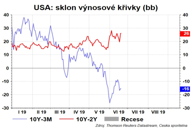 Výnosová křivka v USA se v některých částech začala z inverze lehce vracet, rozdíl mezi desetiletými a tříměsíčními výnosy je ale stále záporný. Tématu se dlouhodobě věnuje hlavní ekonom České spořitelny David Navrátil.