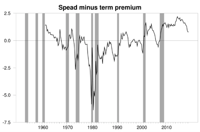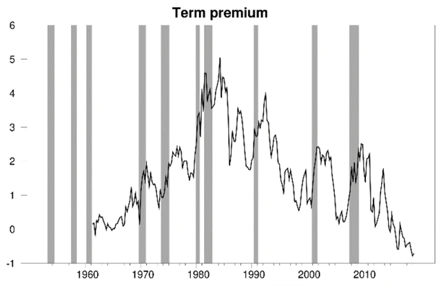 Fed na denní bázi počítá toto rozdělení. A právě časová prémie si prošla velkou mutací. V 70. a 80. letech byla kladná a vysoká. Nicméně postupně klesla a nyní je téměř na -1 procentním bodu.