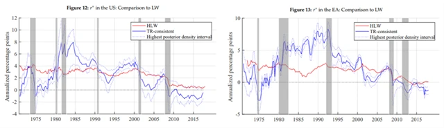 Z analytické dílny Evropské centrální banky vzešel aktuální odhad (pokud máte náladu na více než 50 stran, nastudujte si ZDE). Ten zní, že rovnovážná reálná sazba výrazně poklesla a je nyní záporná, a to jak v USA (kde se blíží nule), tak v eurozóně (zhruba -1 %).