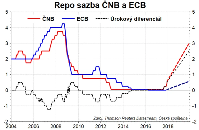 Představa takto dramatického zvyšování sazeb znamená také navýšení úrokového diferenciálu mezi Českem a eurozónou, protože ECB má zatím ke zvyšování sazeb daleko. Podle Maria Draghiho ji nejprve do konce roku 2018 čeká ukončování kvantitativního uvolňování, načež teprve bude na pořadu dne zvyšování sazeb. My v souladu s tím očekáváme první zvýšení sazeb v eurozóně na konci roku 2019.