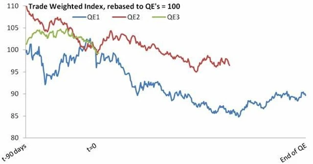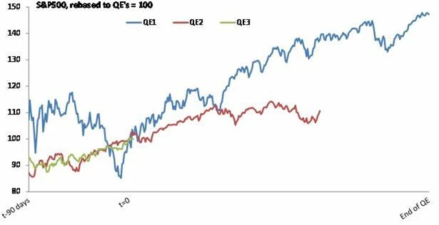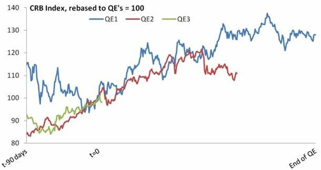 Třetí kolo kvantitativního uvolňování se teprve rozbíhá, jeho dlouhodobý dopad budeme hodnotit později. Analytik Alan Ruskin z Deutsche Bank přesto srovnal vývoj dolaru, akcií a cen komodit v obdobích 90 dnů před oznámením QE1, QE2 a QE3 a v jeho průběhu. Pokud se historie má alespoň rámcově opakovat, jsou dobrým vodítkem toho, co se ve světě investic může v příštích měsících dít.