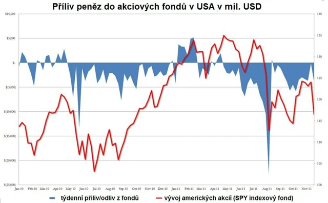 Vývoj trhů v současnosti ovlivňují převážně politické faktory, ale nelze zapomínat na tradiční hybatele hlavních akciových indexů, což jsou peníze v podílových fondech. Pohyby peněz do a z fondů se měří na týdenní bázi a podle poslední statistiky z USA již 14 týdnů v řadě investoři peníze z akciových fondů vybírají. Minulý týden to bylo 3,7 miliardy USD. Od snížení ratingu odteklo z fondů zaměřených na akcie již 44 miliard. Zdá se, že investoři stále nemají žaludek na přehnanou volatilitu, která dnes panuje na akciových trzích.
