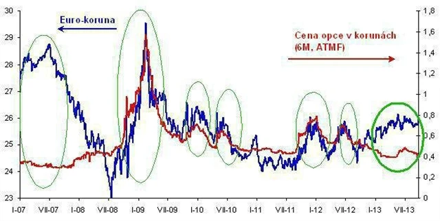 ČNB je po roce úvah dost blízko rozhodnutí začít intervenovat. Nechcete-li prodělat jenom kvůli tomu, že jeden člen Bankovní rady zvedne či nezvedne ruku, měnové opce jsou dobrým a zatím levným zajištěním.