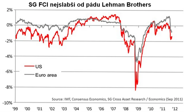 Při zohlednění všech proměnných (podmínky úvěrů, výnosy firemních dluhopisů, úrokové sazby, ceny akcií, ceny domů atd.) je jasné, že je na tom ekonomika zle nedobře. Index ekonomických podmínek (Financial Conditions Index - FCI), který sestavuje Société Générale, je nejníže od pádu Lehman Brothers jak v USA, tak v Evropě.