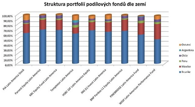Co se geografické struktury portfolia týče, jsou portfolia všech fondů z velké části (50 % - 70 %) tvořeny akciemi brazilských ekonomik následovaných těmi mexickými. Pouze okrajově jsou pak v portfoliu zastoupeny země jako Argentina a Chile, kdy zejména druhá zmiňovaná země oplývá opravdu hojnými zásobami nerostných surovin, které jsou vítaným artiklem v čínských přístavních docích.